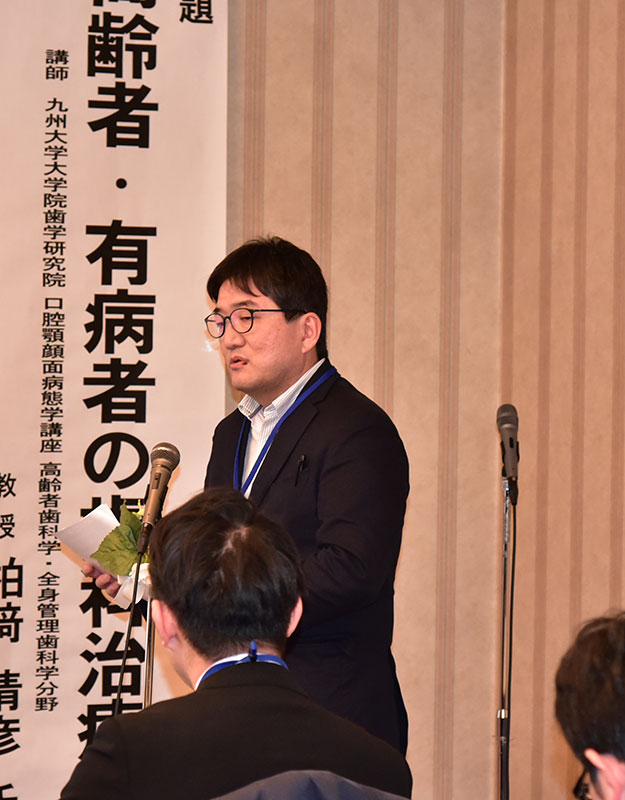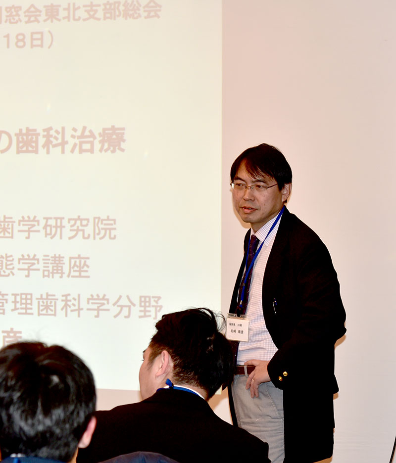 村上公克支部長(10期青森)より歯学部50周年記念式典、祝賀会出席等の報告がありました。 2期6年間支部長をされた村上先生の後任として佐藤暢也先生(13期秋田)が新しい支部長に選出されました。 東北支部の総会では初回参加者の会費無料、2~3回目の参加者は半額として新しい会員の参加を促しておりますが、今回は初回参加が3名、2~3回目の参加者が5名あり、今後もこの形を継続していくことを確認いたしました。 その後九州大学大学院歯学研究院口腔顎顔面病態学講座 高齢者歯科学・全身管理歯科学分野柏﨑晴彦教授(20期)より「高齢者・有病者の歯科治療」の演題で講演をしていただきました。