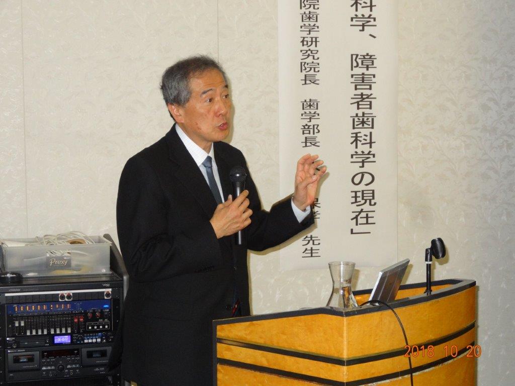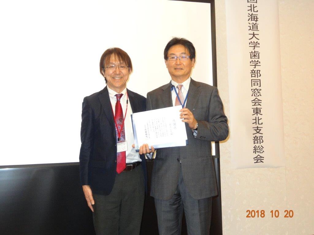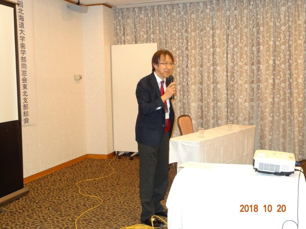 総会に先立ち、10月19日(金)に講師の八若保孝先生と打ち合わせ会を行ない、歓迎会を兼ねた前夜祭を国分町の居酒屋で1次会&2次会に宮城県支部会員5名が参加し楽しい時間を過ごしました。 翌20日(土)は東北支部会員32名の参加をいただき午後3時から理事会、午後4時から総会を行い、昨年まで東北支部長を6年間務めてくださった村上公克先生(青森10期)に感謝状を贈りその労をねぎらいました。続いて平成29年度の収支報告、各県支部の活動報告をし、会則の一部変更を承認いただきました。午後5時から学術講演会を開催しました。今回の講演会は、この4月に北海道大学大学院歯学研究院長・大学院歯学院長・歯学部長に就任された八若保孝小児・障害者歯科学教授(14期)に「小児歯科学、障害者歯科学の現在」と題し講演いただきました。一部に「北海道大学歯学部50周年記念事業と北海道大学歯学部の今」という内容もお話いただき、小児・障害者歯科の話や懐かしい北大歯学部についての話に皆熱心に耳を傾けていました。 講演会後はホテルの別室にて記念撮影をし、懇親会を行いました。佐藤暢也東北支部長(秋田県13期)の挨拶の後、前田雅子先生(岩手県2期)による乾杯で和やかに会が始まりました。なかなかお会いできない東北各県の同窓の先輩、後輩の先生方と会えてとても良い懇親会になりました。ホテルの外で二次会を行いましたが、総会に参加したほとんどの先生に参加いただき、その後3次会でラーメンを食べたりお酒を飲んだりと各々好みの時間を過ごし散会となりました。 翌日21日(日)は八若先生のお帰りになる便が夕方とのことで、同期の磯が松島・瑞巌寺を案内させていただいた後仙台空港までお送りし、今年の東北支部総会が無事に終了しました。 今回の総会には卒後10年以内の若手の先生が6名ご参加いただき、近年、東北支部で力を入れている「若手が参加しやすい環境づくり」が成果として出ているように思えました。 来年の総会は青森県支部の主催で行われます。秋の開催を予定しているそうですので多くの先生方にご参加いただければ幸いです。また来年青森でお会いしましょう。