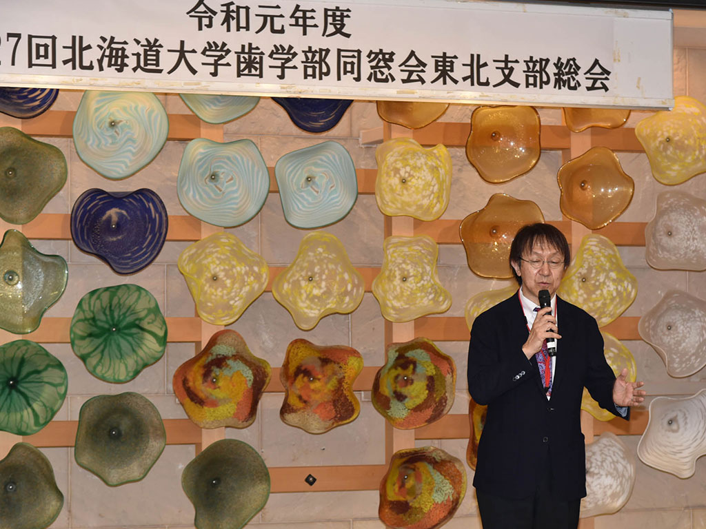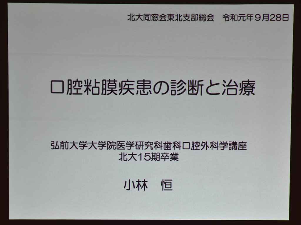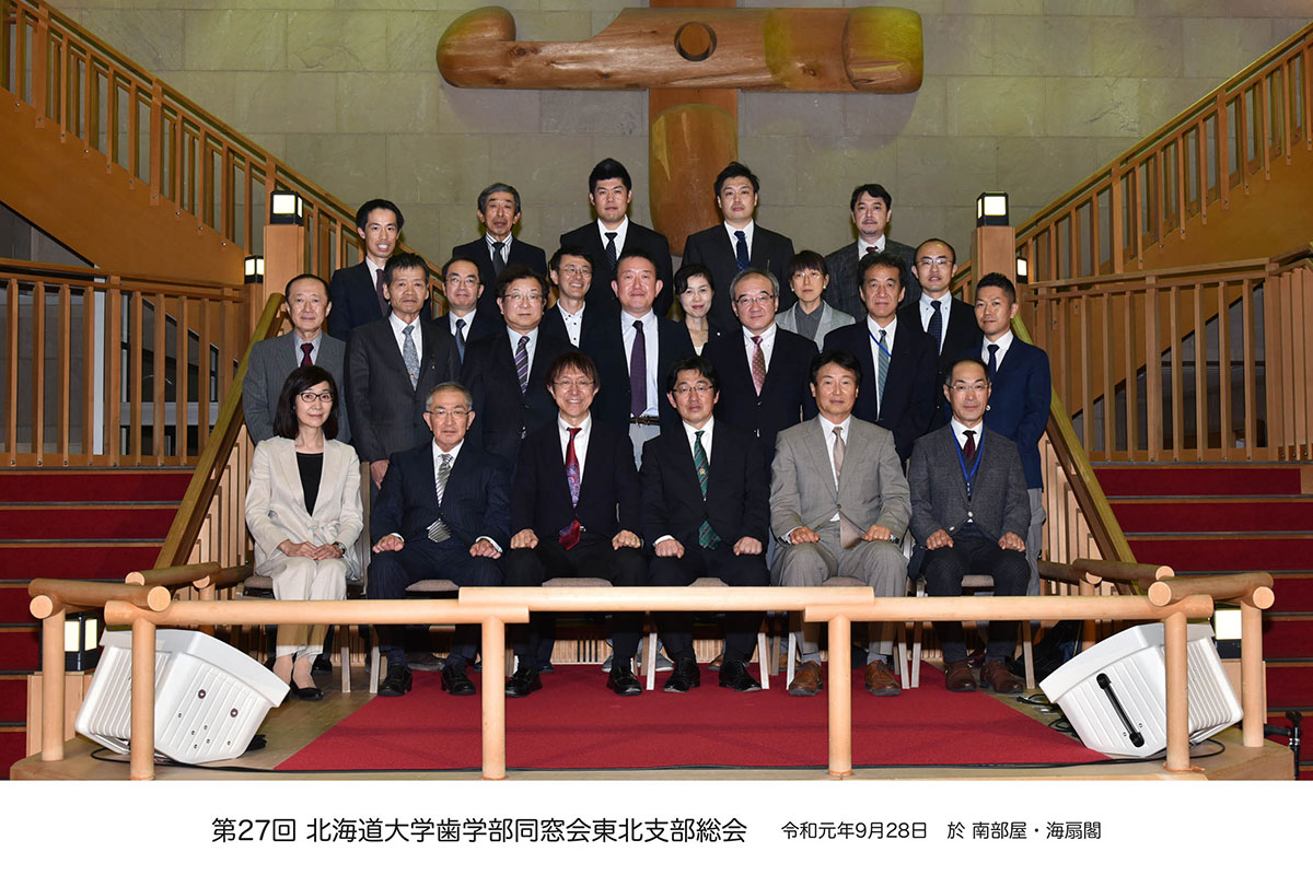2019年(令和元年)9月28日(土)に青森市浅虫温泉の南部屋・海扇閣にて第27回北海道大学歯学部同窓会東北支部総会を開催しました。 今年の東北支部総会には、北海道大学歯学部同窓会長の村井清彦先生にお越しいただき、同窓会の現状についてお話してくださいました。 理事会 14:00~ 総会 15:00~ 開会の言葉(担当県の青森県支部長村上公克先生) 学術講演会 16:00~ 講師 弘前大学大学院医学研究科 歯科口腔外科学講座 教授 小林恒先生(15期) 講演内容は、粘膜疾患の診断、抗菌剤の使用について(経口第3世代セフェム薬はbioavailabilityが非常に低い)、麻痺を出さない智歯抜歯、口腔癌についてなど興味深いものでした。